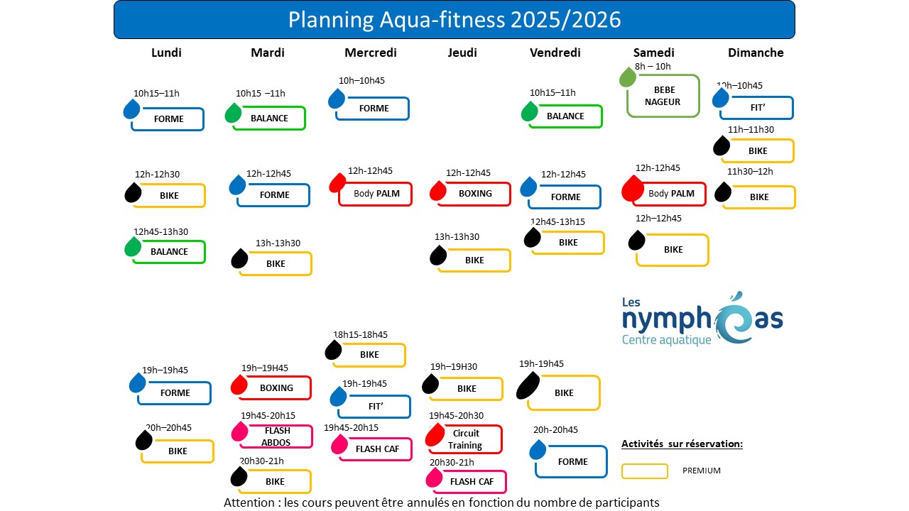 Bassin sportif : 09:00 - 21:00 | Bassin ludique : 09:00 - 21:00 | Fitness : 09:00 - 21:00 | Bien-être : 09:00 - 21:00